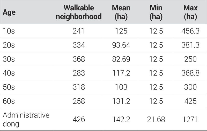 이처럼 동일한 시간을 기준으로 이동을 하더라도 연령대별로 일상활동의 양상이 달라 보행생활권의 공간 범위가 상이하게 나타나는 것을 통해 보행생활권의 시간적 범위와 공간적 범위가 일치하지 않음을 시사한다.