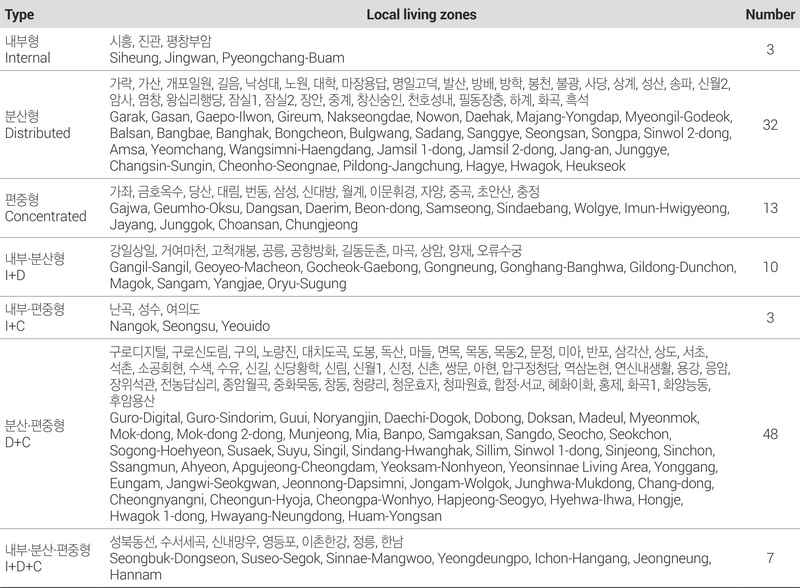 이러한 유형 분석을 바탕으로, 지역생활권별로 실제 유형별 보행생활권이 어떻게 나타났는지 확인하고자 지역생활권에 분포된 보행생활권의 유형을 기준으로 총 7가지 지역생활권 유형으로 재분류하였다(Table 6). 분류 결과, ‘분산형과 편중형 보행생활권을 모두 포함하는 지역생활권’이 가장 많은 48개소로 확인되었으며, 보행생활권이 지역경계를 넘어 연계되는 성격이 강하게 나타났다. 반면, ‘내부형 보행생활권만 포함된 지역생활권’은 진관, 평창부암, 양재 등 3개소에 불과하였으며, 이들은 대부분 녹지지역 인근의 외곽 주거지로 자족적 보행생활권이 뚜렷하게 형성된 생활권으로 해석할 수 있다.