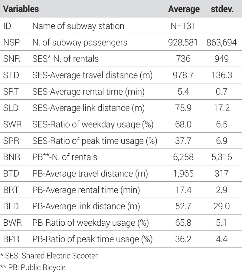 수단별 대여 이력 자료로부터 정량적으로 추출, 집계할 수 있는 정보와 역세권별 부분집합의 특성에 대한 정보를 활용하여, 개인형 공유 모빌리티의 이용특성을 나타내는 변수들을 설정하였다. 먼저 수단별 이용 건수, 이동 거리와 대여 시간, 연계 거리, 평일 및 첨두시간대(08~10시, 18~20시) 이용 비율을 산출하고, 대중교통을 이용하는 유동 인구를 대변하는 변수로 지하철 승하차 인원을 추가하였다. 이에 13개의 이용특성 변수를 정의하고, 각각에 대해 기술통계를 검토하였다(Table 1).