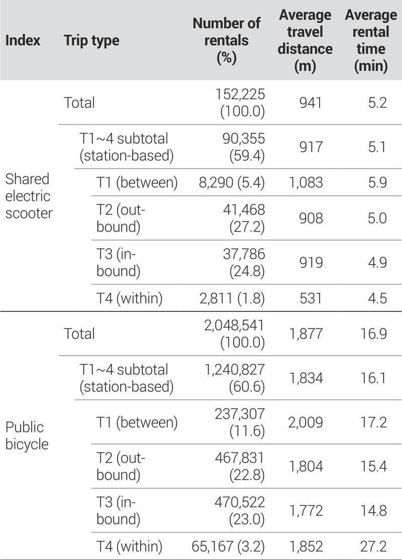 통행유형별 평균 이동 거리와 대여 시간을 비교해 보면(Table 2), 동일 역세권 내의 통행(T4)에서 수단 간 차이가 두드러졌다. 공유 전동 킥보드는 T4의 이동 거리와 대여 시간 모두 가장 짧았는데, 대여 시간에 비해 이동 거리가 더 짧게 나타났다. 이와 반대로 공공 자전거는 T4의 대여 시간이 공유 전동 킥보드에 비해 매우 길게 나타난 부분이 특정적이었다. 이는 공공 자전거가 여러 목적지를 경유하여 다시 출발점 근처로 되돌아오는 회유형(운동, 여가 등의 목적) 통행수단으로 이용되고 있음(사경은 외, 2020)을 시사한다.