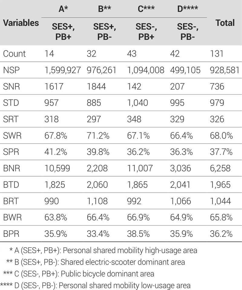 두 수단 모두 활성화된 A 지역은 14개, 공유 전동 킥보드 우위 지역 B는 32개, 공공 자전거 우위 지역 C는 43개, 두 수단 모두 비활성화되어 있는 D 지역은 42개로 나타났다. 4개 그룹에 속한 지역들의 기술통계는 다음과 같다. 먼저 A 지역은 지하철 승하차 인원(NSP)과 공유 전동 킥보드의 첨두시 이용 비율(SPR)이 가장 높았고 공공 자전거의 주중 비율(BWR)은 가장 낮았다. B 지역은 지하철 승하차 인원(NSP)의 규모는 A 지역에 비해 약 61%에 불과했지만, 공유 전동 킥보드 이용량(SNR)은 더 많았는데, 평균 이동거리(STD)가 짧아 단거리 이동수단으로 자주 활용되고 있음을 알 수 있다. 또한 두 수단 모두에서 주중 이용 비율(SWR, BWR)이 높아, 상대적으로 주말의 활성화 정도가 낮은 지역들이 많이 포함되었을 것으로 해석된다. C 지역은 공공 자전거의 주중 및 첨두시 이용 비율(BWR, BPR)이 높은 반면, 공유 전동 킥보드의 비율(SWR, SPR)은 낮았다. 두 수단 모두 이용량이 적은 D 지역은 지하철 승하차 인원(NSP)이 가장 적어, 대중교통 연계통행의 수요 자체가 크지 않은 지역으로 볼 수 있다.