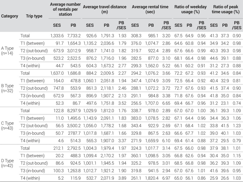 수단별 활성화 정도가 다른 각 그룹에서 역세권 연계통행 유형에 따른 세부 특성을 비교해 보았다(Table 4). A 지역의 경우, 두 수단 모두 T2(out-bound) 통행이 T3(in-bound) 통행보다 많았으며, 이는 내부에서 외부로 나가는 통행이 더 활발하다는 것을 의미한다. 이동 거리와 대여 시간에서 두 수단은 유사한 패턴을 보였고, 주중 및 첨두 시간의 경우, T2 통행에서는 두 수단 간의 차이가 크지 않았으나, T3 통행에서 공유 전동 킥보드는 첨두시 이용이 집중되는 경향이 관찰되었다. 이를 통해 공유 전동 킥보드가 첨두 시간에 더 많이 이용되는 특성이 있다는 점을 확인할 수 있었다.