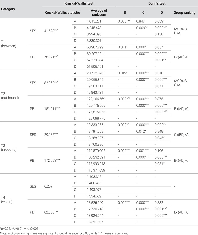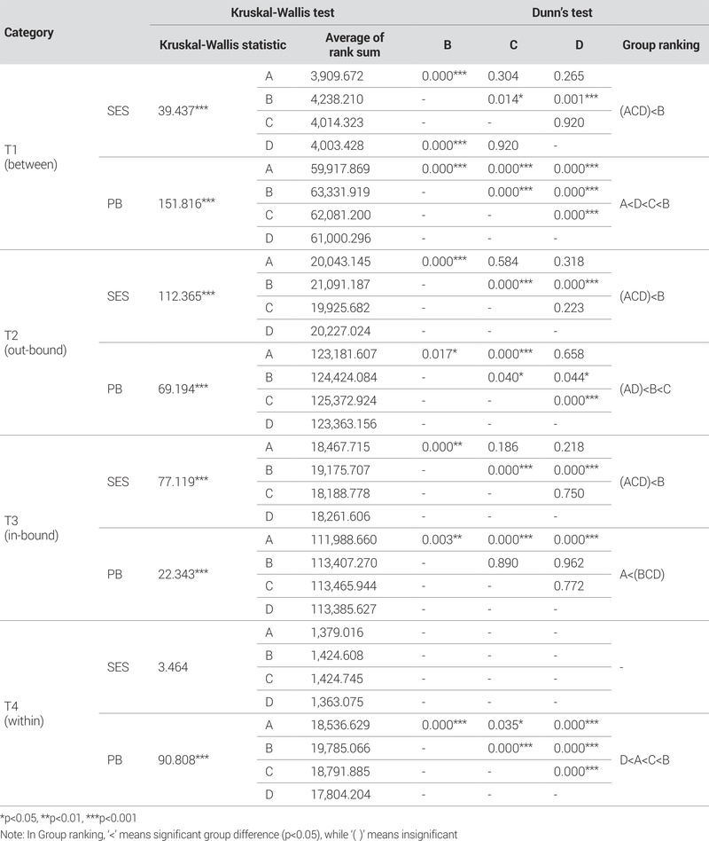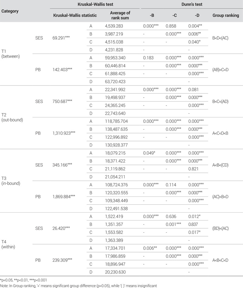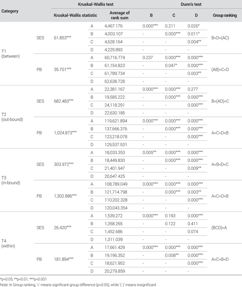 T1 통행에서는 두 수단 모두 B 지역의 주중 이용 비율이 가장 높게 나타났다(Table 7). 한편, C 지역에서 공공 자전거의 주중 이용 비율이 가장 낮게 나타났으며, 공유 전동 킥보드는 B 지역을 제외한 3개 역세권의 차이는 크지 않았다. T2 통행은 수단별 주중 이용 비율 특성이 높은 지역 차이가 있었다. 공유 전동 킥보드는 B 지역에서 이용비율이 높은 반면, 공공 자전거는 C 지역에서의 이용비율이 높게 나타났다. T3 역시 B 역세권에서 공유 전동 킥보드의 주중 이용 비율이 가장 높게 나타났다. 공공 자전거는 A 지역에서 가장 낮게 나타났으며, 이외 지역은 유의미한 차이가 없었다. 한편, T4 통행에서는 공유 전동 킥보드의 통행 간 유의미한 차이를 확인하지 못하였다. 공공 자전거는 B 지역에서 주중 이용 비율이 가장 높고 D 지역에서 가장 낮게 나타났다.