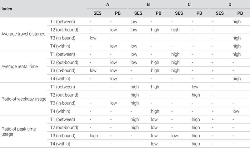 공유 전동 킥보드와 공공 자전거 모두 상대적으로 비활성화되어 있는 D 지역은 다른 지역과 달리 두 수단 모두 T3 통행이 가장 많은 것으로 나타났다. D 지역은 공공 자전거의 역내 통행(T4)의 특징이 가장 두드러진 지역으로 공유 전동 킥보드와 이동 거리 및 대여 시간의 차이가 가장 크게 나타나 출퇴근 등의 목적이 아닌 여가 및 운동 등의 여가형 통행일 가능성이 높으며 이러한 특징이 가장 잘 드러난 지역이라 할 수 있다.