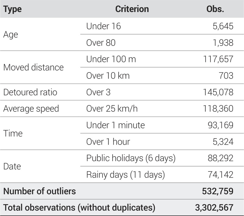 분석의 공간적 범위는 서울시로, 통행 출발 및 도착 지점이 모두 서울시 내부인 통행만을 분석에 활용하였다. 시간적 범위는 요일별 기온 편차가 상대적으로 적은 2023년 4월~9월로 설정하였으며, 공휴일 및 시간당 강수량이 30mm를 초과하는 날짜는 범위에서 제외하였다. 이후 선행연구를 참고하여 <표 2>와 같이 통행 이상치를 제거하였다(McKenzie, 2019; Zou et al.. 2020; Hosseinzadeh et al., 2021). 최종적으로 532,759건(원자료의 13.89%)의 통행을 제거 후, 총 3,302,567건의 통행을 분석에 활용하였다. ㈜더스윙에서 운영하는 전동킥보드 개수는 서울시에 등록된 전동킥보드의 약 33%를 차지하며, 이에 따라 서울시를 중심으로 전동킥보드 이용행태의 시공간적 특성 분석을 위한 대표성을 충분히 가질 것으로 판단하였다(서울특별시, 2023).