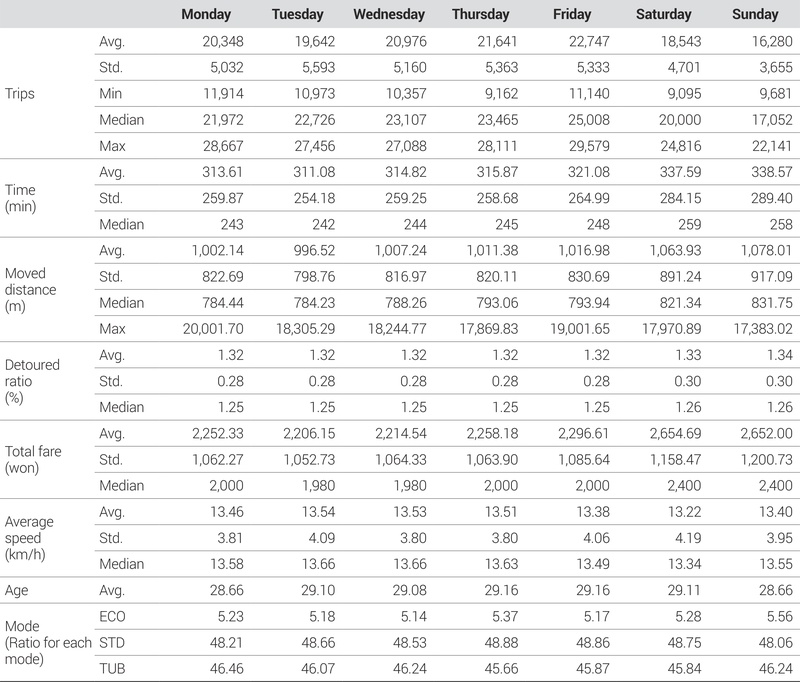 우선, 통행 수의 경우 단위별로 집계되는 통행 수를 활용하였으며, 통행시간은 통행 종료와 시작 간의 차이를 분 단위로 계산하여 활용하였다. 이동 거리와 우회비는 통행 별 상세 경로를 기반으로 각각 실제 이동거리를 계산한 값과 이를 Origin(O)과 Destination(D) 지점 간의 직선 최단거리와 비교한 값을 활용하였다. 다음으로, 연령대는 이용자 수가 가장 많은 20대와 30대 및 기타 연령대로 구분하였다. 마지막으로 할인 수혜율은 공유서비스 이용에 대해 전체 금액 대비 할인받은 금액의 비율이며, 주행 모드는 사람들이 실제 공유서비스 이용 시 설정한 구분을 그대로 활용하였다.