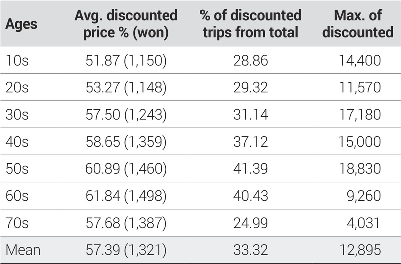 우선, 전체 통행 중 할인받은 통행의 시간대별 평균은 30.87%(표준편차 2.01), 할인 수혜율은 55.75%(표준편차 3.28) 시간대별 큰 차이가 나타나지 않았다. 반면 연령대별로 구분할 경우, 할인 통행 비율의 평균은 33.32%(표준편차 3.40), 평균 할인 수혜율은 57.39%(표준편차 5.86)로 상대적으로 높은 편차가 나타났다. 특히, 40대~60대에 대해 상대적으로 할인 받은 통행 비율과 할인 수혜율이 높게 나타났다. 이는 특정 연령대의 이용자 수요 확보를 위해 할인과 같은 대책을 제안할 수 있음을 시사하며, 이를 통해 특정 연령대의 대체 이동수단에 대한 기회를 제공할 수 있을 것으로 판단된다. 연령대별 평균 할인 수혜율의 경우 <표 5>와 같다.