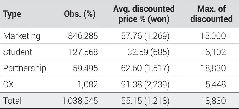 주2. 원자료에는 별도 유형이 구분되어 있지 않으나, 할인 세부 내용을 바탕으로 연구자가 임의로 분류함.