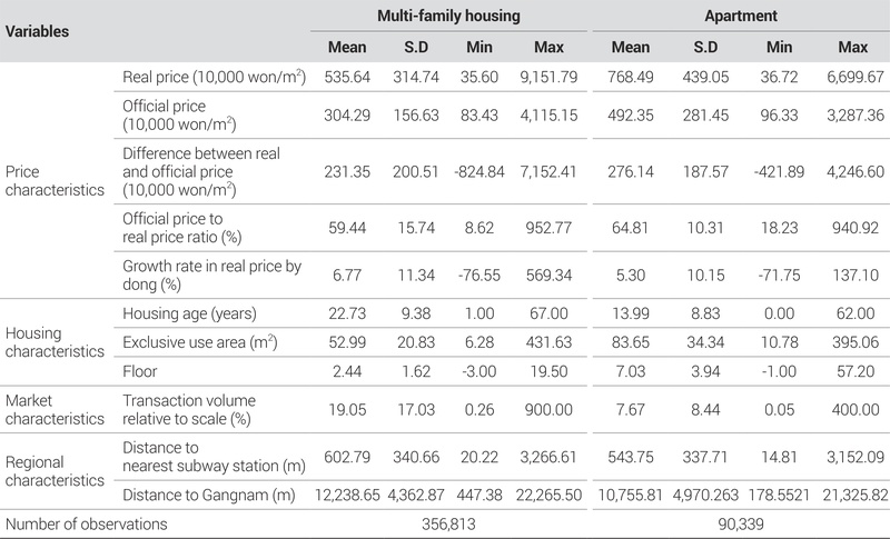 본 연구에서 사용한 자료는 2006년부터 2023년이지만, 2005년 자료의 부재로 2006년의 동별 실거래가 증가율을 구성할 수 없어 2007년부터 2023년 자료를 바탕으로 분석을 진행하였다. <표 1>은 분석에 사용된 변수들의 기술통계를 나타낸다.