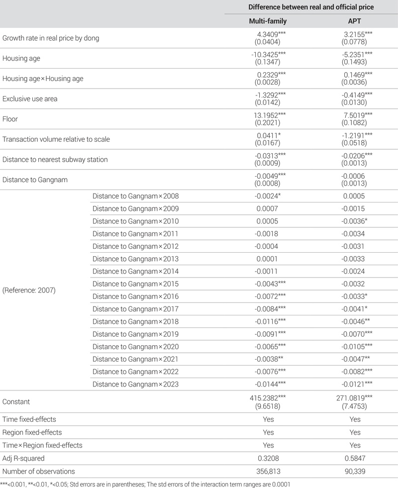 <표 2>는 연립다세대 주택 및 아파트의 실거래가와 공시가격의 차이에 영향을 주는 요인을 분석한 결과이다. 분석결과, 두 유형 모두 주택이 위치한 해당 동의 실거래가 상승률이 증가할수록 실거래가와 공시가격의 차이가 커지는 것으로 나타났다. 즉, 주택시장의 여건이 좋아서 실제로 거래되는 주택의 가격이 상승하면, 실거래가와 공시가격의 차이는 커진다고 할 수 있다. 이를 해석하면, 주택시장의 상황이 좋은 경우에는 거래되는 주택의 매매가격이 자연스럽게 증가하지만, 정부에서 공식적으로 산정하는 공시가격의 수준은 이러한 시장상황을 제대로 반영하지 못한다고 할 수 있다.