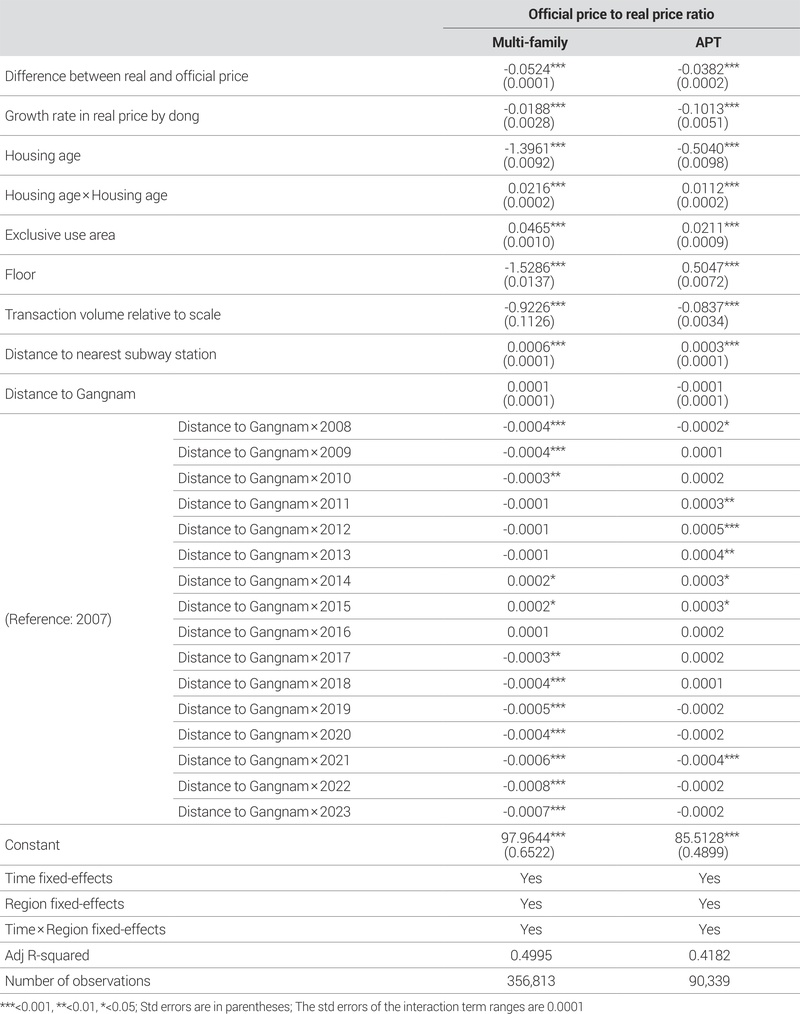 <표 3>은 공시가격이 실거래가를 얼마나 반영하고 있는지를 나타내는 현실화율을 종속변수로 설정하고 분석한 결과이다. 실거래가와 공시가격 차이의 절댓값이 크더라도, 이 차이가 실거래가와 공시가격 간의 비율로 동일하게 반영되지 않을 수 있다. 예를 들어, 고가 주택의 경우 실거래와 공시가격의 절대적 차이가 크더라도 상대적 비율은 작을 수 있으며, 저가 주택에서는 실거래가와 공시가격의 절대적 차이는 작지만 상대적 비율은 클 수 있다. 따라서, 본 연구에서는 절대적 차이뿐만 아니라 상대적 차이를 반영한 현실화율을 종속변수로 설정하고 분석을 수행하였다.