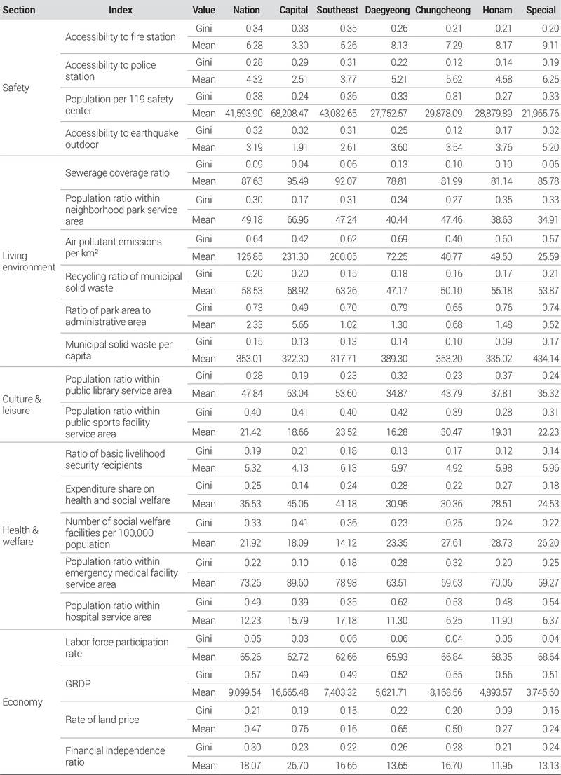 본 절에서는 32개 지표에 대한 전국 및 권역별 불균형도를 파악하고자 한다. 분야별로 지역 격차 수준을 살펴보면 다음과 같으며, 권역별 지니계수를 통해 권역 내 격차 또한 유추할 수 있다(<Table 3>, <Table 4> 참고). 권역별 평균값은 다음 절의 지니계수 분해분석 결과에서 함께 비교하여 권역 간 불균형 현황을 살펴보았다.