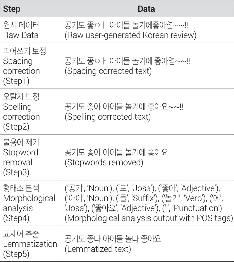 수집한 리뷰 데이터를 바탕으로, 한국어 텍스트의 언어적·구조적 특성을 반영하기 위해 Python의 다양한 자연어 처리 라이브러리를 활용하였다. 구체적인 데이터 전처리 과정은 다음과 같다(<표 1> 참조).