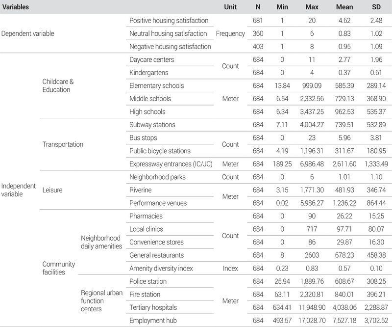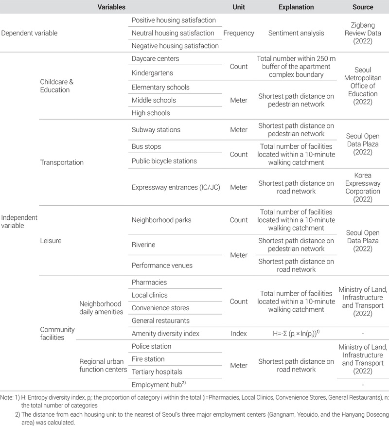 종속변수는 ‘긍정적 주거만족도 빈도’, ‘중립적 주거만족도 빈도’, ‘부정적 주거만족도 빈도’이다. 독립변수는 선행연구검토를 통하여 확인한 아파트 주거만족도에 영향을 미치는 도시민의 생활과 관련된 시설이며, 이를 ‘보육 및 교육’, ‘교통’, ‘여가’, ‘생활시설’로 분류하였다. 생활시설은 국토교통부·행정안전부에서 제시한 생활SOC 분류체계(관계부처합동, 2019)를 참고하여 시설의 기능적 위계와 이용 범위에 따라 두 가지로 다시 구분하였다. 첫번째는 도보 생활권에서 일상적으로 이용되는 생활밀착형 편의시설(Neighborhood Daily Amenities)이며, 두 번째는 지역거점 기능시설(Regional Urban Function Centers)로 정의하였다(<표 3> 참조). 이 범주들은 도시민의 일상생활 접근성 관점에서 주거만족도에 영향을 미친다는 선행연구 결과를 고려한 것이다(권준현·이수기, 2023; 장윤정·고승욱, 2021).