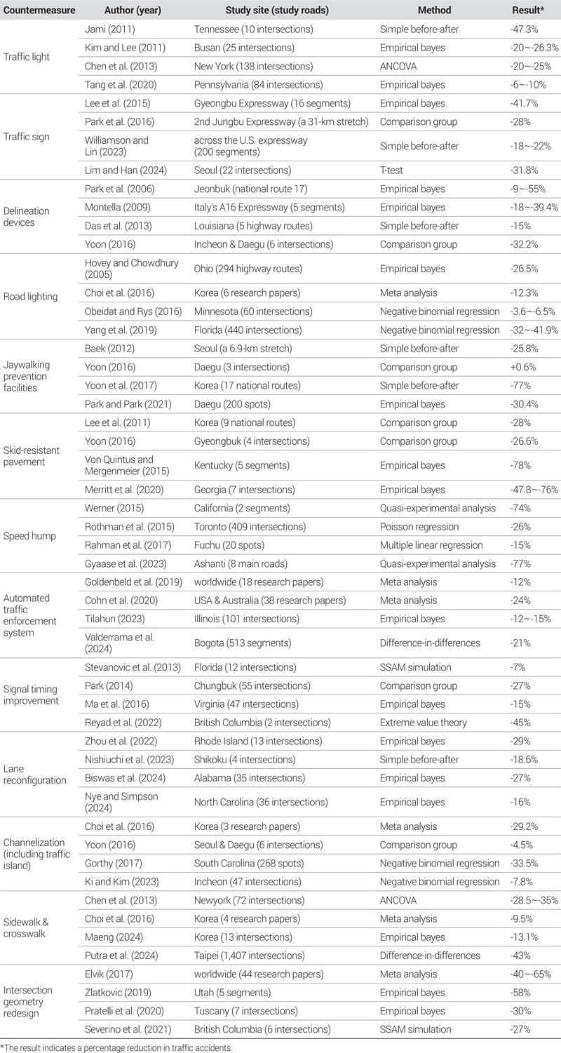 There are many previous studies analyzing the effectiveness of countermeasures, most of which have examined the reduction in accidents following the implementation of traffic safety countermeasures. <Table 1> summarizes previous studies on each of the 13 traffic safety countermeasures covered in this study, with four studies summarized for each countermeasure.