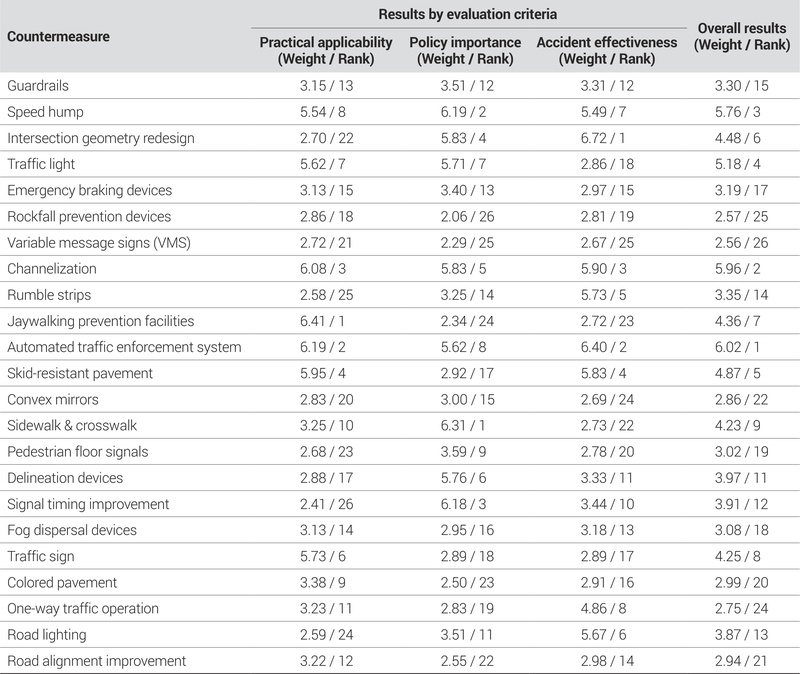 Three evaluation criteria were set: practical applicability, policy significance, and accident reduction effectiveness. Practical applicability refers to the feasibility and ease of on-site implementation, policy significance refers to the relevance to national traffic safety policy goals, and accident reduction effectiveness refers to the contribution to reducing traffic accidents.