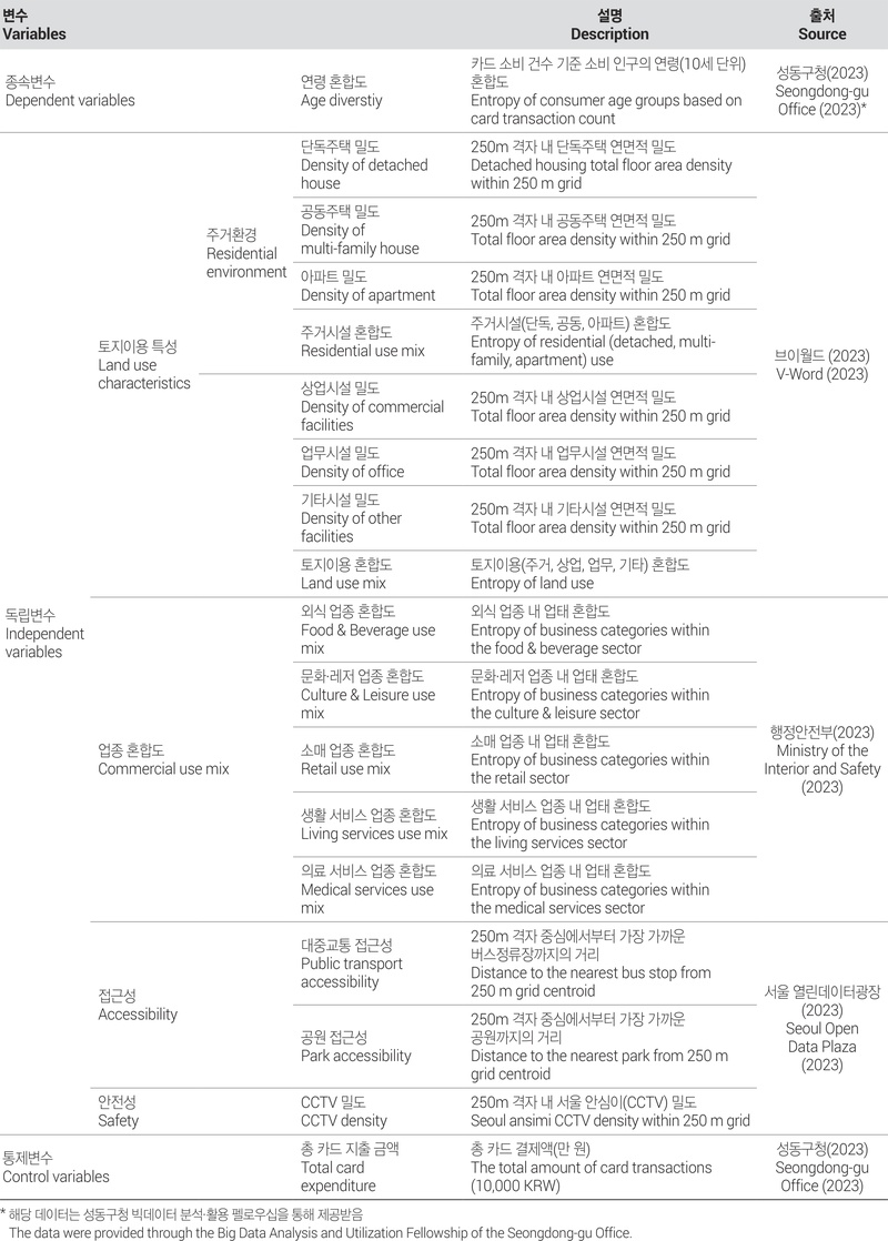 또한, 정보통신기술의 발전으로 도시 내 활동을 정밀하게 분석할 수 있는 빅데이터 활용이 가능해지면서 스마트카드 데이터, 생활인구 데이터, 모바일 위치 정보, 은행 카드 데이터 등을 활용한 실증적 연구가 활발히 이루어지고 있다. 이러한 도시 빅데이터를 통해 도시공간 내 인구의 활동을 보다 정확하고 동적인 방식으로 분석할 수 있는 기반이 마련되었다(Kim, 2018). 그중에서도 은행 카드 데이터를 통해 나타나는 소비 활동은 도시의 다양한 인구가 동일 공간을 공유하며 상호작용하는 대표적인 활동 중 하나이다. 소비 패턴은 방문하는 인구의 연령, 성별, 사회경제적 지위, 소득 수준 등과의 특성과 관련이 있으며(채희원·신정엽, 2015), 이러한 요인들이 도시공간 내 특정 환경에서 연령 혼합도에 영향을 미칠 수 있다. 예를 들어, 레스토랑이나 공원과 같은 공공공간은 다양한 연령층의 교류를 촉진할 수 있지만, 특정 업종이 집중된 공간은 일부 연령층의 이용만을 유도해 분리를 심화시킬 수 있다(Wong and Shaw, 2011). 이처럼 소비 데이터를 활용한 기존 연구에서는 주로 상권 내 업종 구성이나 연령별 소비 접근성 등을 바탕으로 소비 활동이 어떻게 촉진되는지 분석해왔다. 그러나, 소비 공간에서 다양한 연령층이 어떻게 혼합되고 있는지, 그리고 이에 도시환경이 어떤 영향을 미치는지에 대한 연구는 아직 부족한 실정이다.