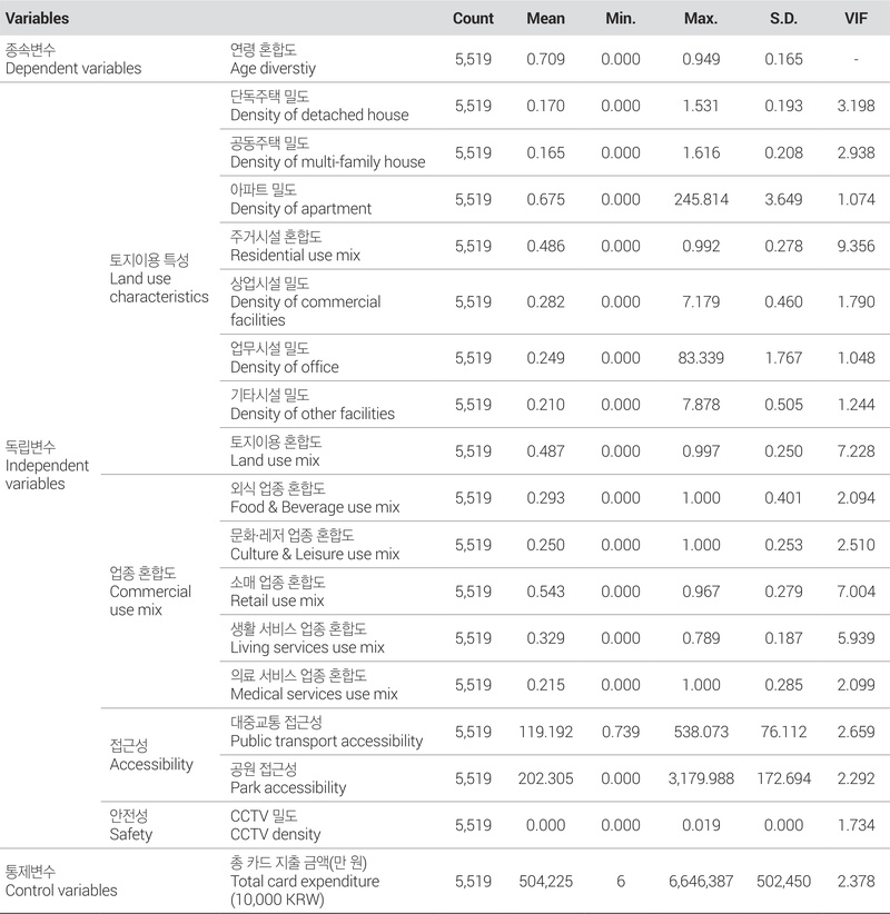 업종 혼합도는 각 업종에 따른 혼합도(cum)로 나타내며, 앞서 <표 1>에서 설정한 바와 같이 문화, 생활 서비스, 소매, 식품, 건강 업종의 지방행정 인허가 데이터를 바탕으로 세부 구성 업태별 혼합 수준을 각각 측정하였다. 업종에 따른 세부 업태 그룹 수가 상이하나, 0과 1 사이의 값으로 정규화하였다. 독립변수들 간의 다중공선성을 검증하고자 분산팽창계수(Variance Inflation Factor, VIF)를 검토하였다. 모든 독립변수의 VIF가 10 미만으로 나타나, 다중공선성 문제는 크게 없는 것으로 확인하였다.