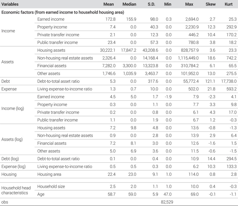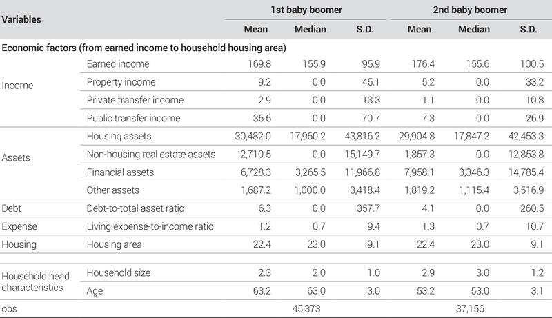 <Table 2>에서는 베이비부머 가구주 가구의 전반적인 특성을 파악하기 위하여 평균, 중앙값, 표준편차, 최솟값, 최댓값, 왜도, 첨도를 산출하였으며, 소득과 자산은 세부 유형별로 구분하여 살펴보았다.