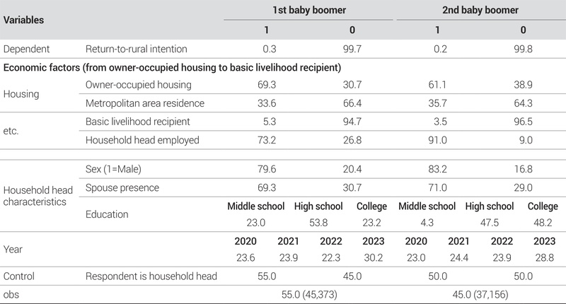 주거 요인은 자가주택 거주여부, 수도권 거주여부, 주택면적(평)을 사용하였다. 김유하 외(2023)는 자가주택 거주가 귀농·귀촌 의향에 부정적인 영향을 미침을 실증하였는데, 해당 연구에서는 1·2차 베이비부머의 차수를 통합하여 분석함에 따라 자가주택 거주가 세대별로 차이가 있는지에 대한 검증이 이루어지지 않은 상황이다. 또한 김동훈·윤종열(2023)의 연구에서는 수도권 거주여부가 귀농·귀촌 의향에 부정적 영향을 미치는 것으로 나타났는데, 통계청(2025)의 「2024년 귀농어·귀촌인통계」에 따르면 귀농·귀촌인의 직전 거주지 중 가장 많은 비중을 차지하는 시·도는 경기도(26.1%)인 것으로 나타났으며 42.7%는 직전 거주지가 수도권인 것으로 나타나 수도권 거주가 귀농·귀촌 의향에 부정적 영향을 미치고 있다는 해당 연구 결과에 대한 교차검증이 필요하다.
