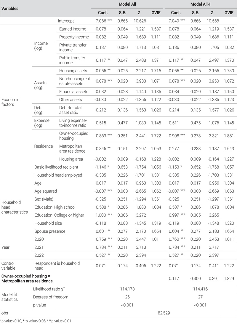 마지막으로, 상호작용항(자가거주여부×수도권 거주여부)을 추가한 <Table 8>의 우측의 Model All-I 분석 결과, 전체 베이비부머 집단에서 상호작용항(자가 거주 여부×수도권 거주 여부)은 통계적으로 유의하지 않은 것으로 나타났다.