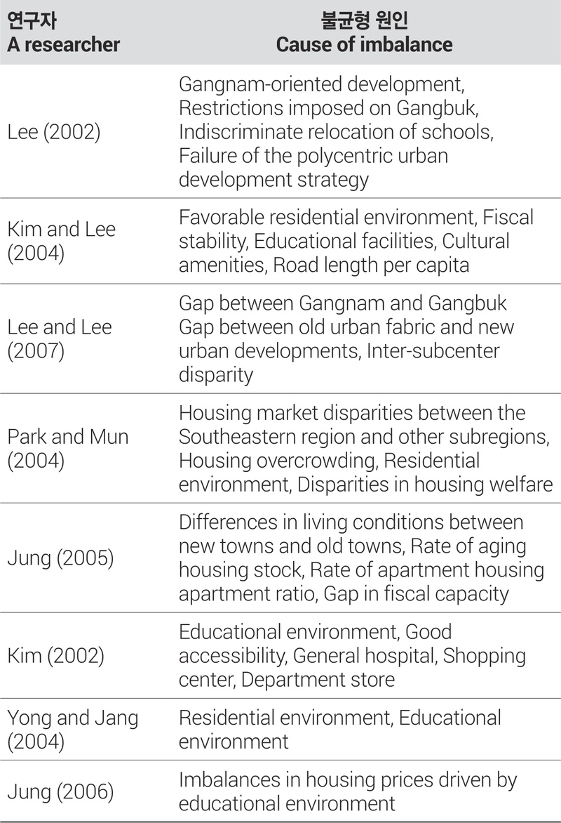 서울의 지역 간 불균형 원인을 분석한 대부분의 연구는 불균형의 차이를 아파트 가격 수준의 차이로 규정하고 가격차이가 발생하는 현황지표를 설정함으로써 원인을 밝히고자 하였다. 현재 아파트 가격에 영향을 미치는 현황 중심의 분석으로 권역별 형성배경의 차이에 대한 고찰이 다소 미흡하였다.