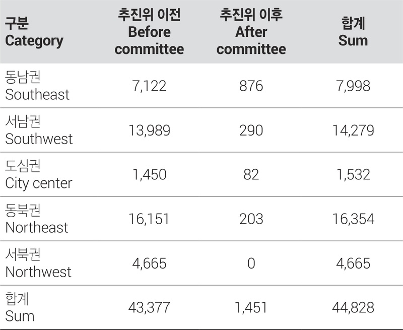 넷째, 본 연구의 중요한 재건축 특성인 사업추진단계 변수의 권역별 영향을 비교분석하기 위해서 추진위원회 승인단계 이상인 거래사례가 없는 서북권을 제외하고 분석함으로써 서북권의 특성을 확인하지 못하였다. 서북권은 2000년대 들어 아파트가 대규모로 공급된 지역으로 향후 재건축 추이를 살펴볼 필요성이 높은 지역이다. 최근 거래사례를 확인하여 서울 전체 5개 권역을 대상으로 한 비교분석은 추후 과제로 남기고자 한다.