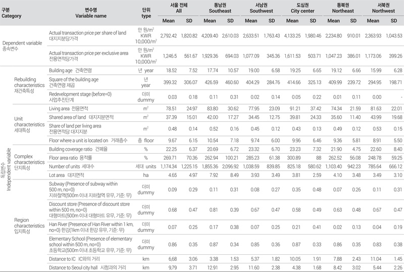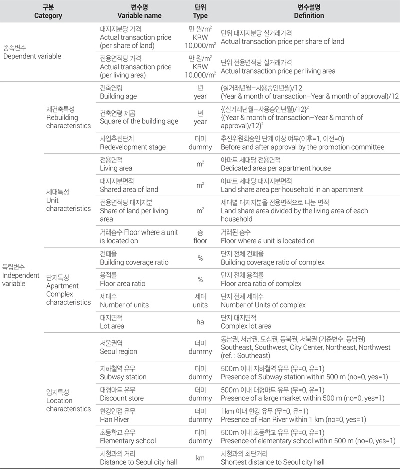 본 연구에서는 건축연령이 증가함에 따라 재건축 아파트 대지지분 가치의 변화가 서울 권역별로 실질적인 차이가 나는지를 실증분석하기 위해 선행연구를 참고하여 변수를 검토하였으며 정리된 변수는 <Table 3>과 같다.