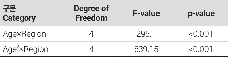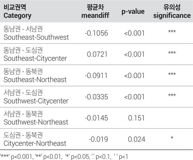 다중회귀분석 후, 각 권역별 건축연령에 대한 회귀계수값의 실질적인 차이를 확인하기 위해 분산분석(ANOVA)을 실시한 후 Tukey HSD 분석을 통한 사후검정을 진행하였다.