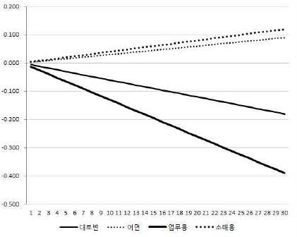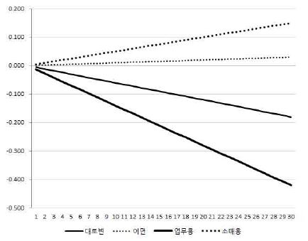 표 4의 하단 그림은 추정된 회귀계수를 통해 경과연수가 임대료에 미치는 영향이 건물의 용도나 위치에 따라 어떻게 달라지는지 보여주고 있다. 건물이 대로변(가는 실선)에 있거나 업무용(굵은 실선)으로 사용되는 경우 경과연수가 길어질수록 단위면적당 임대료는 하락한다. 그러나 건물이 이면(가는 점선)에 있거나 소매용(굵은 점선)으로 사용되고 있을 때 오히려 경과연수가 길어질수록 단위면적당 임대료가 상승한다. 구체적으로 살펴보면 30년을 기준으로 할 때 대로변 건물은 3.3㎡당 월세가 0.182만원이 낮게 형성되지만, 이면에 위치한 건물은 3.3㎡당 월세가 0.083만원 높게 형성된다. 용도의 경우 30년을 기준으로 할 때 업무용 건물은 3.3㎡당 월세가 0.390만원 낮게 형성되지만, 소매용 건물은 오히려 0.120만원 높게 형성된다.
